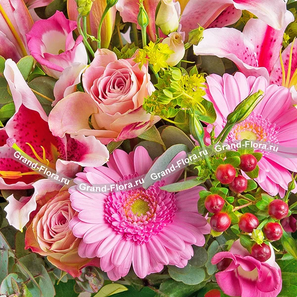 Стандартный: лилия розовая - 2 шт., роза розовая - 5 шт., гербера розовая - 4 шт., эустома розовая - 3 шт., гиперикум красный - 3 шт., эвкалипт - 3 шт., рускус - 3 шт., бант розовый.